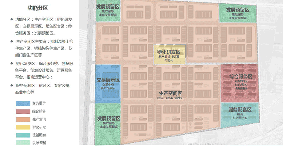 生產空間區;孵化研發區;交易展示區;服務配套區;綜合服務區;發展預留區。